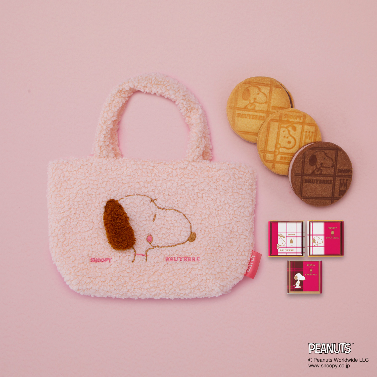 もこもこ生地に、立体的な耳がかわいいスヌーピーのミニトートバッグ。中には、2種類のビスキュイサンド(計3枚)と、2種類のチョコレート(計3個)が入っています。