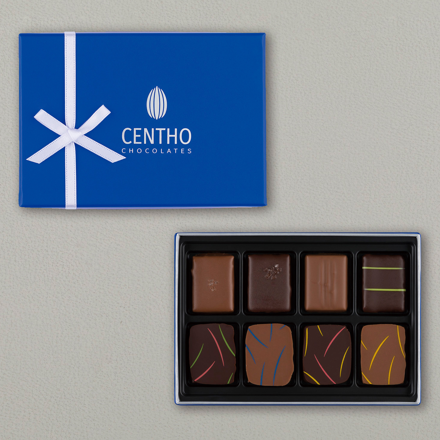 それぞれのカカオと相性のよいフルーツジャムとのペアリングを楽しめる「フラゴラ」「ブラックベリー」「アプリコット」「パッションフルーツ」の3層仕立ての4粒と、代表粒の「塩キャラメル」はもちろん、塩キャラメルチョコレートとピスタチオプラリネを二層にした2026年の新粒「ピスタルダ」など個性豊かなキャラメルチョコレート4粒をアソートしました。カカオの味を引き立たせるこだわりのガナッシュと、セントー自慢のキャラメルチョコレートの両方を堪能できるセレクションです。