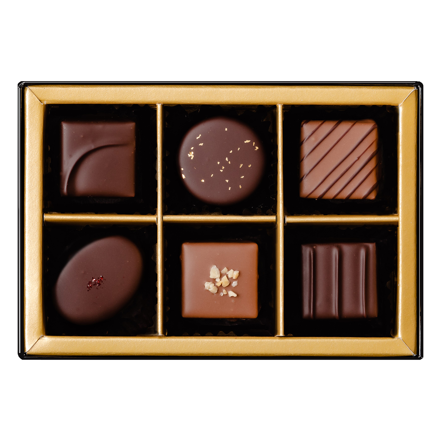 ●詰合せ内容:6粒入(ヒンビアー、マンデル、ラム、ベルガモット、デメル、カラメル)