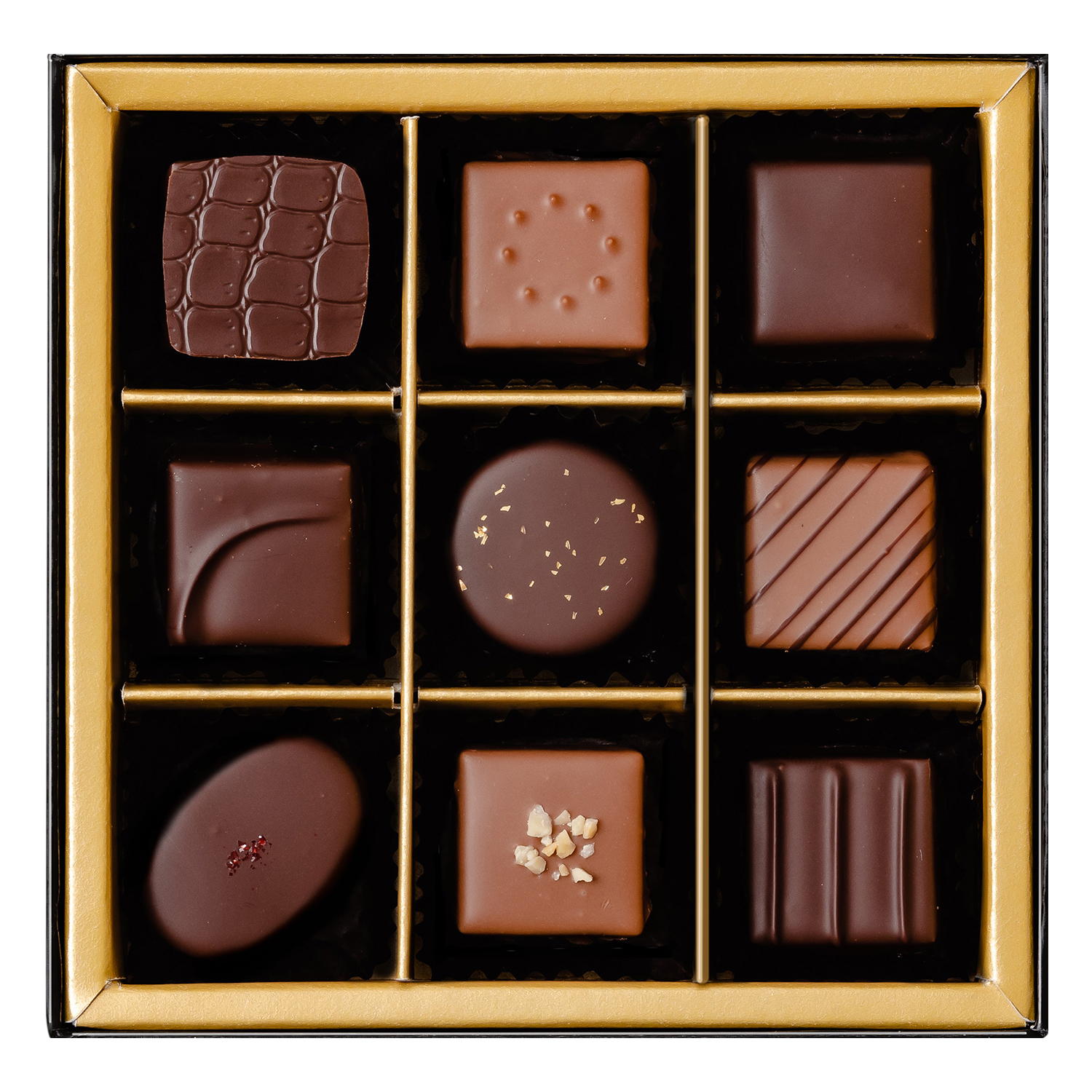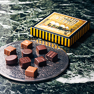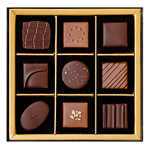 ●詰合せ内容:9粒入(フィアンティーヌ、ピスターチ、ヒンビアー、マンデル、ラム、ベルガモット、デメル、カラメル、シュバルツァーティー)