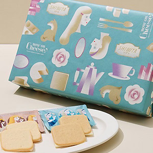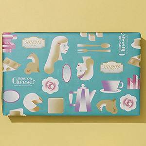スモーキーな風味が魅力的な「スモークチーズ&カマンベール」、しっかりしたチーズ感の「カラメル&ゴルゴンゾーラ」をアソートしました。華やかな渋谷をイメージした限定の包装紙をかけました。