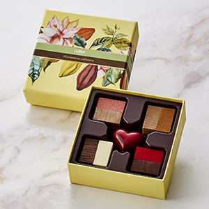 日本生まれの生チョコレートがベルギー・アントワープにて再解釈と共に更なる進化を遂げました。ストロベリー&ミルクチョコレート、バニラ&ダークチョコレート、ヘーゼルナッツ&ミルクチョコレート、ラズベリー&ダークチョコレートの生チョコレート4種と、芳醇な香りを放つレッドハートパッションを詰め合わせました。