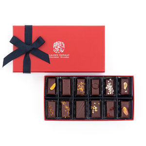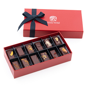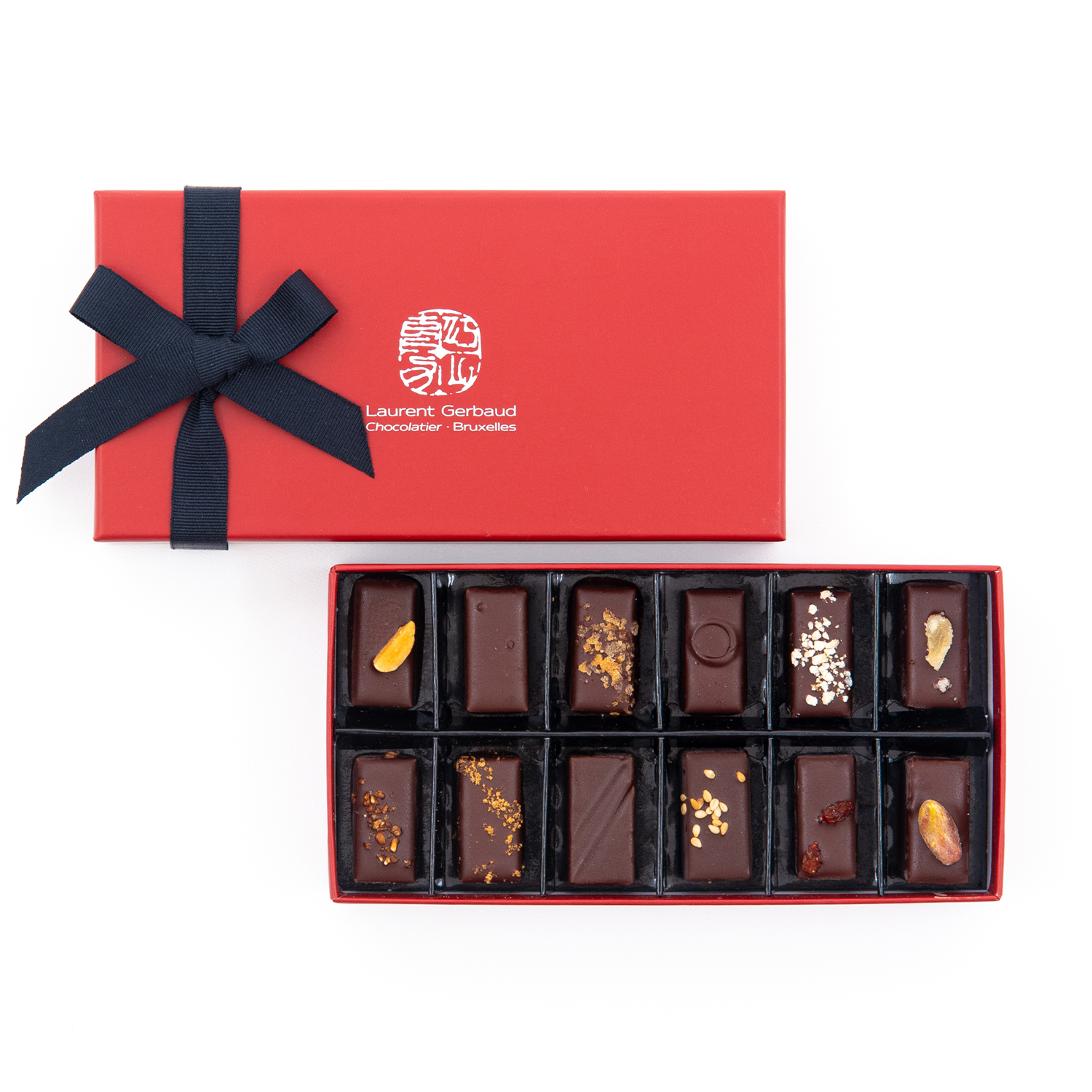 プラリネ12種(ピスタチオ、ペカンナッツ&クランベリー、セサミ、アーモンド、スペキュロス、ヘーゼルナッツ、バックウィート、ジンジャー、フィアンティーヌ、クランブル、ウォールナッツ、ピーナッツ)のアソート。ダークチョコレートコーティングで甘さを控え、豊かで芳醇なナッツの風味を楽しめる一品です。
