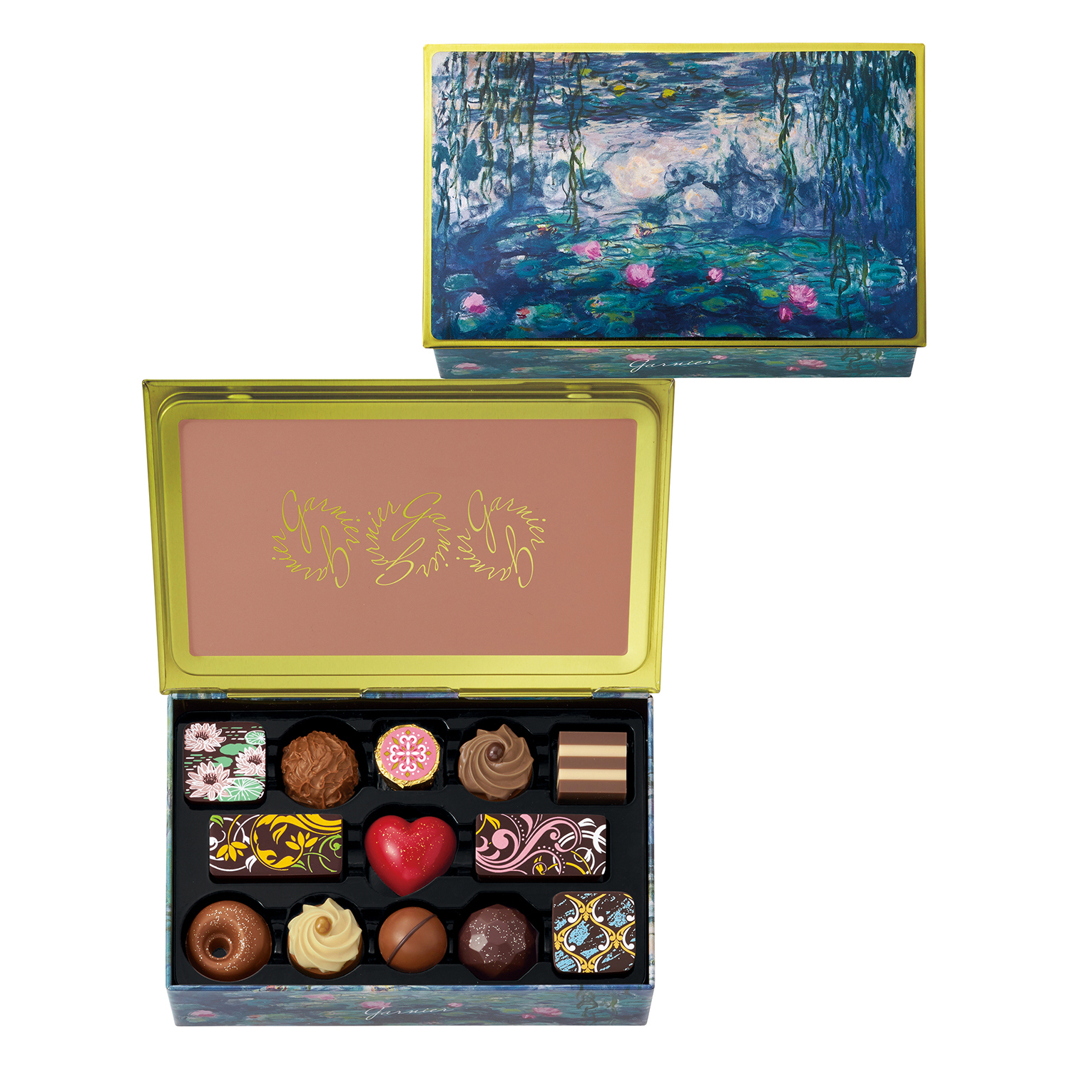 世界的に人気のある名画クロード・モネ『睡蓮』のパッケージに、ひとつひとつ丁寧に仕上げた小粒のチョコレートなどを詰め合わせました。