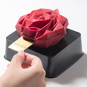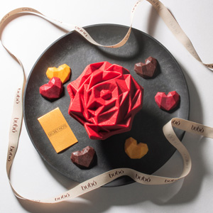 「愛情」「情熱」といった花言葉を持つ、真紅のバラのチョコレート。リボンをほどくと、鮮やかに咲き誇るバラが姿を現し、まるで宝石箱を開けた時のような感動が広がります。ダークチョコレートでかたどったバラの中に、心ときめく3種のハート(ポップロック、マカダム、ブラウニー)を2つずつ詰め込みました。メッセージカードに想いを綴り、バラの中へ添えれば、世界にひとつだけの贈り物に。ジュエリーを選ぶように心を込めて贈りたい、大切な人への特別なひと箱です。