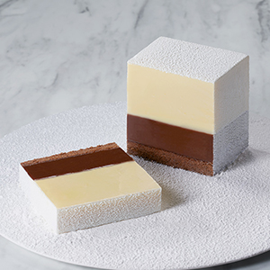 牛乳本来の風味を大切にしたホワイトガナッシュとミルクチョコレート、しっとりと仕上げたブラウニーが、緻密に計算された比率で層を成し、誰がカットしても、どこをカットしても美しい断面が現われます。口に運び、幸福なミルク感にたっぷりと浸ってください。