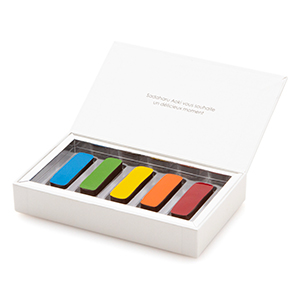 蓋を開けると化粧パレットをイメージしたカラフルなショコラがずらりと並ぶ、サダハルアオキの代表的ショコラ。その日の気分で口紅のカラーを選ぶように、その時の気分に合わせてフレーバーが選べるようにと、心地よい酸味が楽しめるフランボワーズや、アオキが得意とする和素材使いを堪能できるマッチャやユズなど様々な味わいのショコラがアソートになっています。