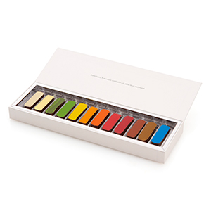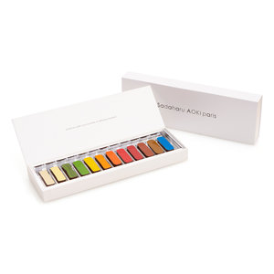 蓋を開けると化粧パレットをイメージしたカラフルなショコラがずらりと並ぶ、サダハルアオキの代表的ショコラ。その日の気分で口紅のカラーを選ぶように、その時の気分に合わせてフレーバーが選べるようにと、心地よい酸味が楽しめるフランボワーズやパッションフルーツ、アオキが得意とする和素材使いを堪能できるマッチャやユズなど様々な味わいのショコラがアソートになっています。