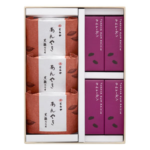 ●詰合せ内容:小形羊羹『ラムレーズン』50g×4本、『あんやき』黒糖カカオ26g×3個