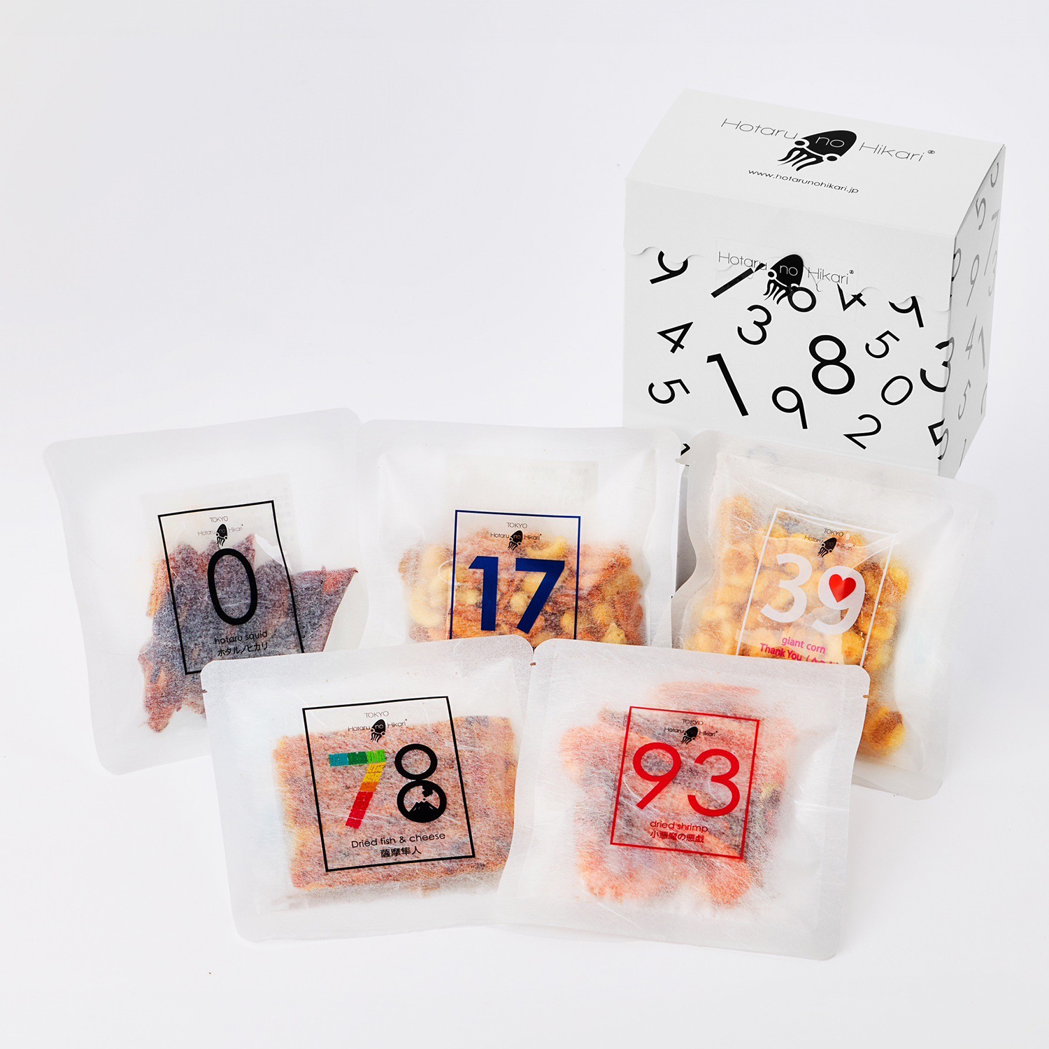 ●詰合せ内容:No.0ホタルノヒカリ(ホタルイカいしり干)、No.17 Dreams come true(燻製・柿の種MIX)、No.39(梅昆布ジャイアントコーン)、No.78薩摩隼人(カツオ&チーズ)、No.98小悪魔の悪戯(甘えび素干し)
