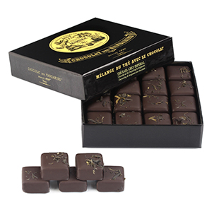 マリアージュ フレールならではのお茶を使ったチョコレート。パリから空輸で届くこのチョコレートはダージリンにベルガモットの香りをつけた香り高いアールグレイ インペリアルを使ったチョコレート。ダークチョコレートのガナッシュをダークチョコレートでコーティングし、繊細に茶葉をあしらった味わい深いチョコレート。