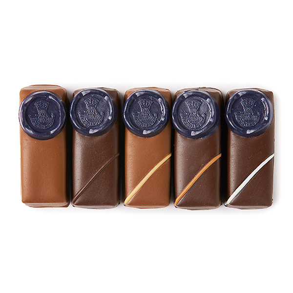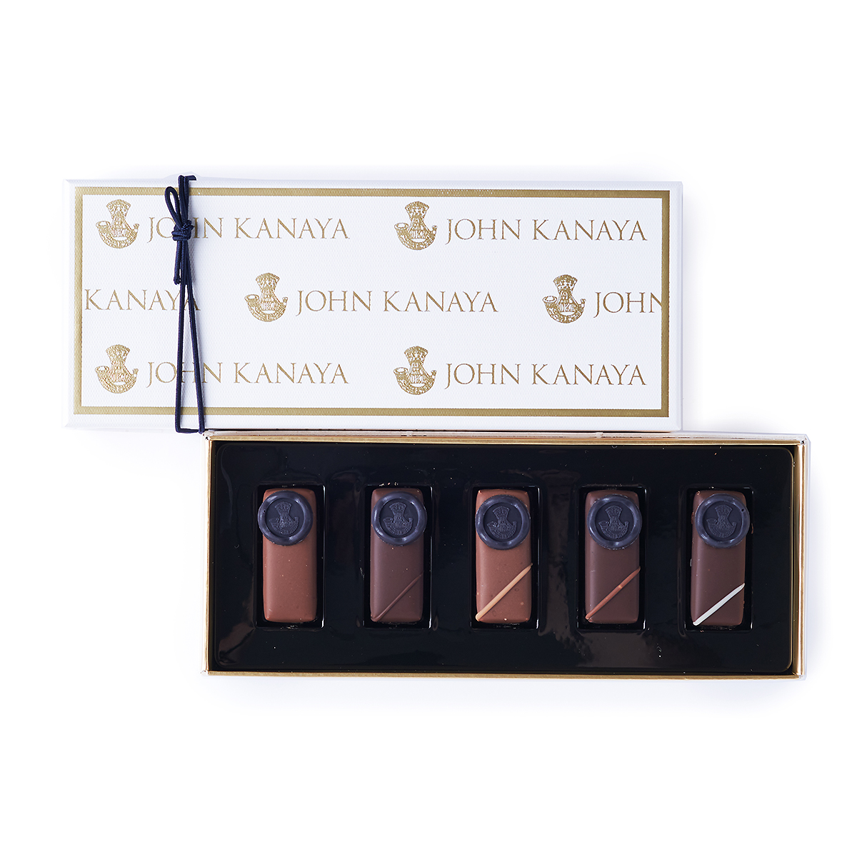 「ダンディズム」をテーマとするショコラトリーJOHN KANAYAの一番人気商品。ミルクチョコレートとの相性が良いくるみのリキュール「ノチェロ」や、スターアニスの香りが華やかな「アブサン」。洋梨リキュールのエレガントな味わいが楽しめる「ポワール」。ブランデーとスイートチョコレートが織りなす芳醇なアロマと濃密で奥深い味わいの「アルマニャック」。金谷鮮治が愛したお酒「赤ワイン」は、ワインの風味を感じていただくために、生クリームを使用せず甘さ控えめに仕上げました。