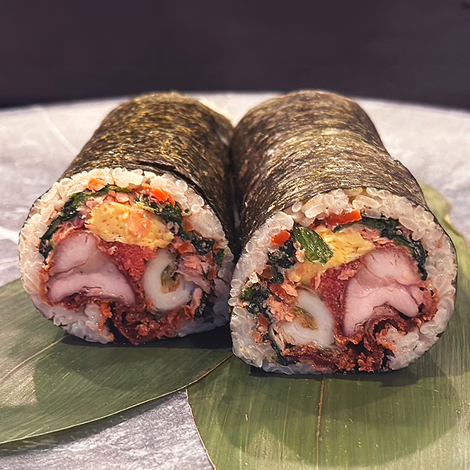 ●内容:海苔、出汁ご飯、ちくわの磯部揚げ、から揚げ、明太子、だし卵、ほうれん草胡麻和え、鮭、明太子