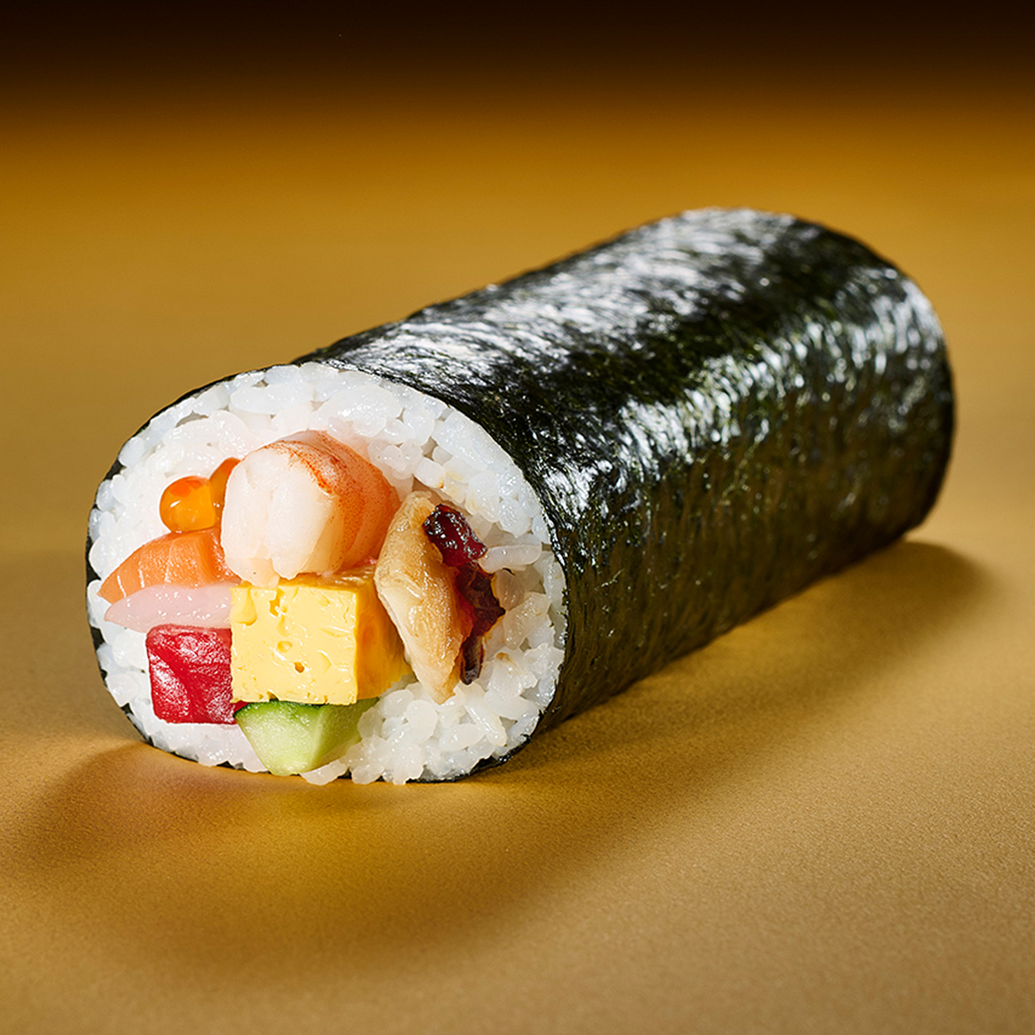●内容:1本(本まぐろ赤身、いくら、海老、サーモン、いか、煮穴子、中具※、玉子焼、大葉、きゅうり)※椎茸とかんぴょうを刻んで煮込んだもの