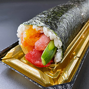 ●内容:海鮮巻き 1本(まぐろ、いか、えび、サーモン、とびっこ、玉子、きゅうり)●サイズ:長さ18cm●商品に含まれるアレルギー特定原材料8品目:卵、乳成分、小麦、えび●アルコール使用:なし●消費期限:お受け取り日当日中※お受け取りの際は「ご注文確定メール」を当日プリントしてご持参いただくか、スマートフォンの受信画面をご提示ください。※お申し込み後のキャンセルやお受け取り日時の変更はご容赦ください。※お受け取りの際、店頭にてお並びいただく場合がございます。