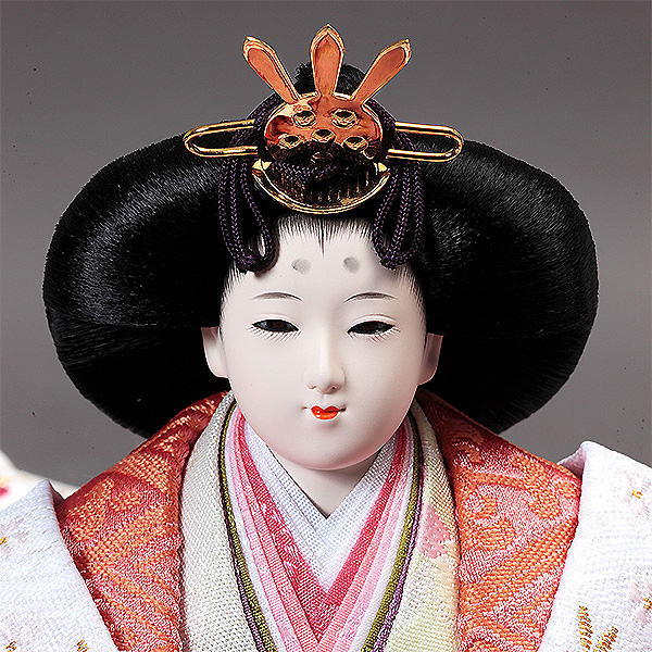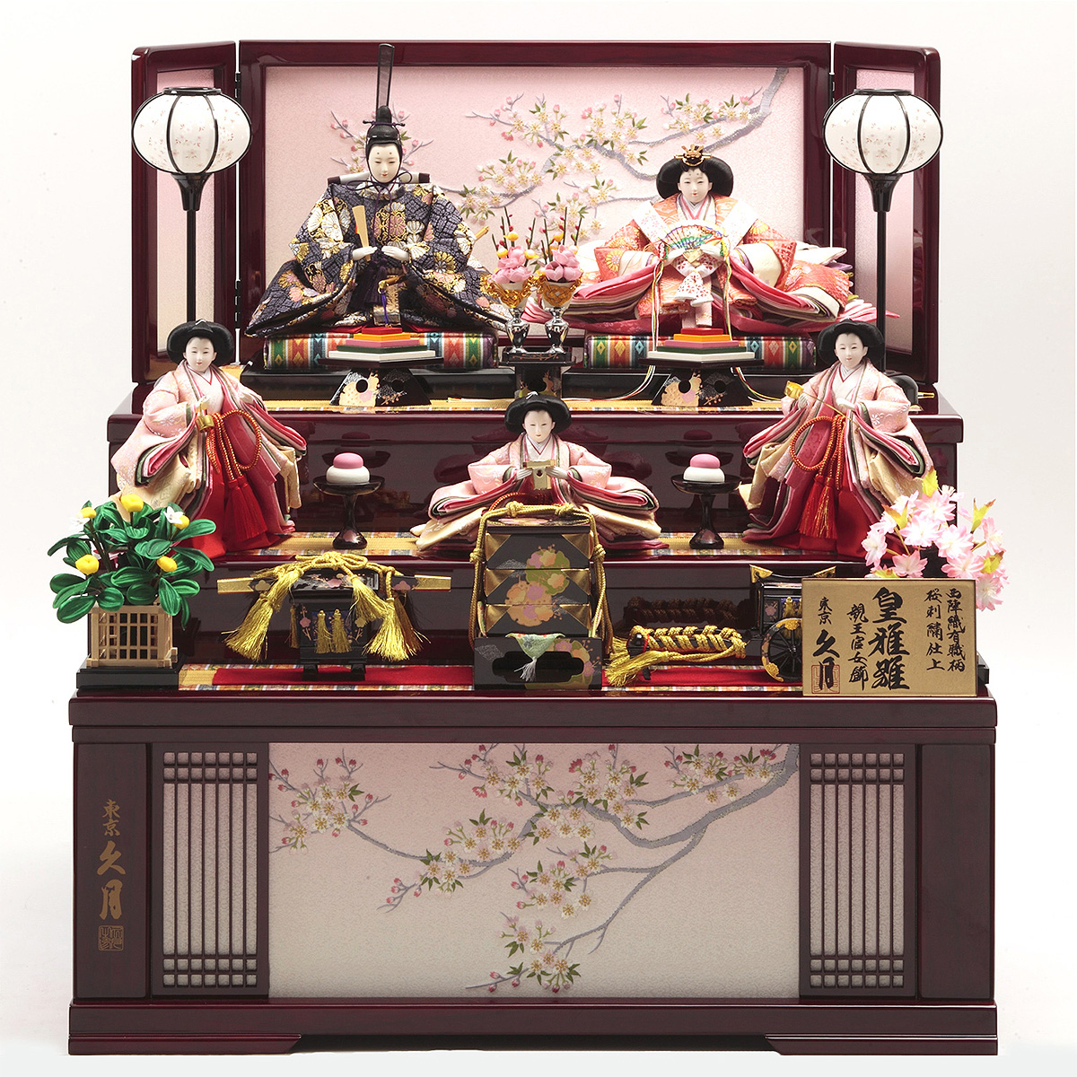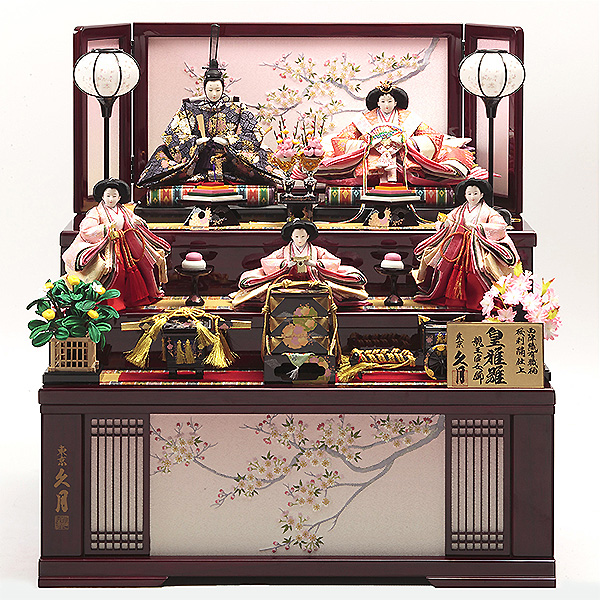 ピンクの刺繍屏風と飾台が優しく感じられる豪華な収納五人飾り。>>東急百貨店のひな人形 商品一覧