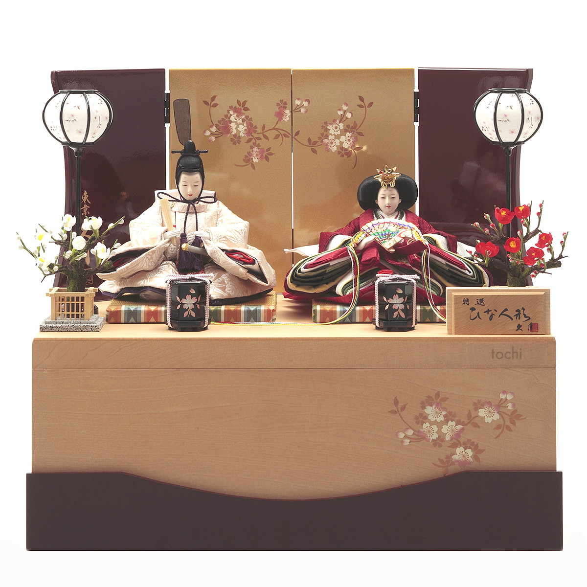 栃を素材とした優しさあふれる収納箱と、落ち着いた色合いのおひなさまが見事に調和した収納飾りです。>>東急百貨店のひな人形 商品一覧