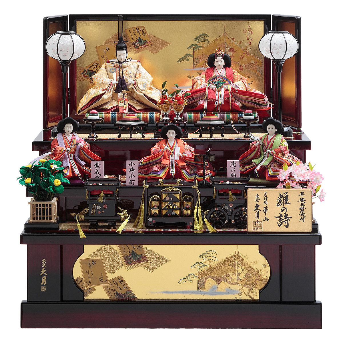 三人官女の代わりに、お子様が優しく賢く美しく育つようにという願いをこめて、平安三賢女と呼ばれる「清少納言」「小野小町」「紫式部」を配しました。>>東急百貨店のひな人形 商品一覧