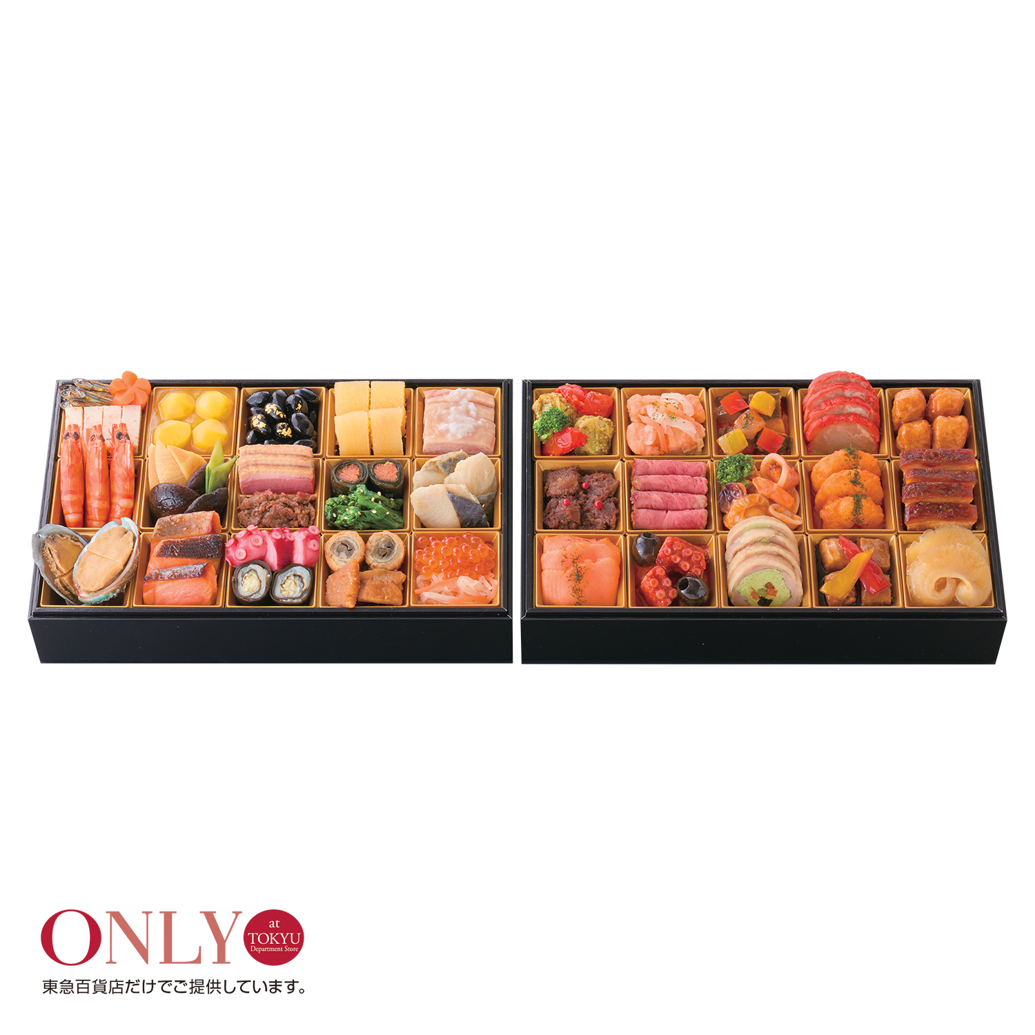 田作り煮、蟹真丈、梅型ねじり人参煮、車海老旨煮、あわび煮、栗きんとん オレンジ風味、煮物、鮭西京焼、金箔黒豆煮ミント風味、合鴨山椒風味、牛肉のしぐれ煮、たこ梅酢和え、鯛龍皮巻、北海道産数の子、きくらげ煮、紅鮭昆布巻、なの花おひたし、穴子八幡巻、たら煮、鶏の燻製塩麹ソース、鰆西京焼、味付いくら、柚子なます
