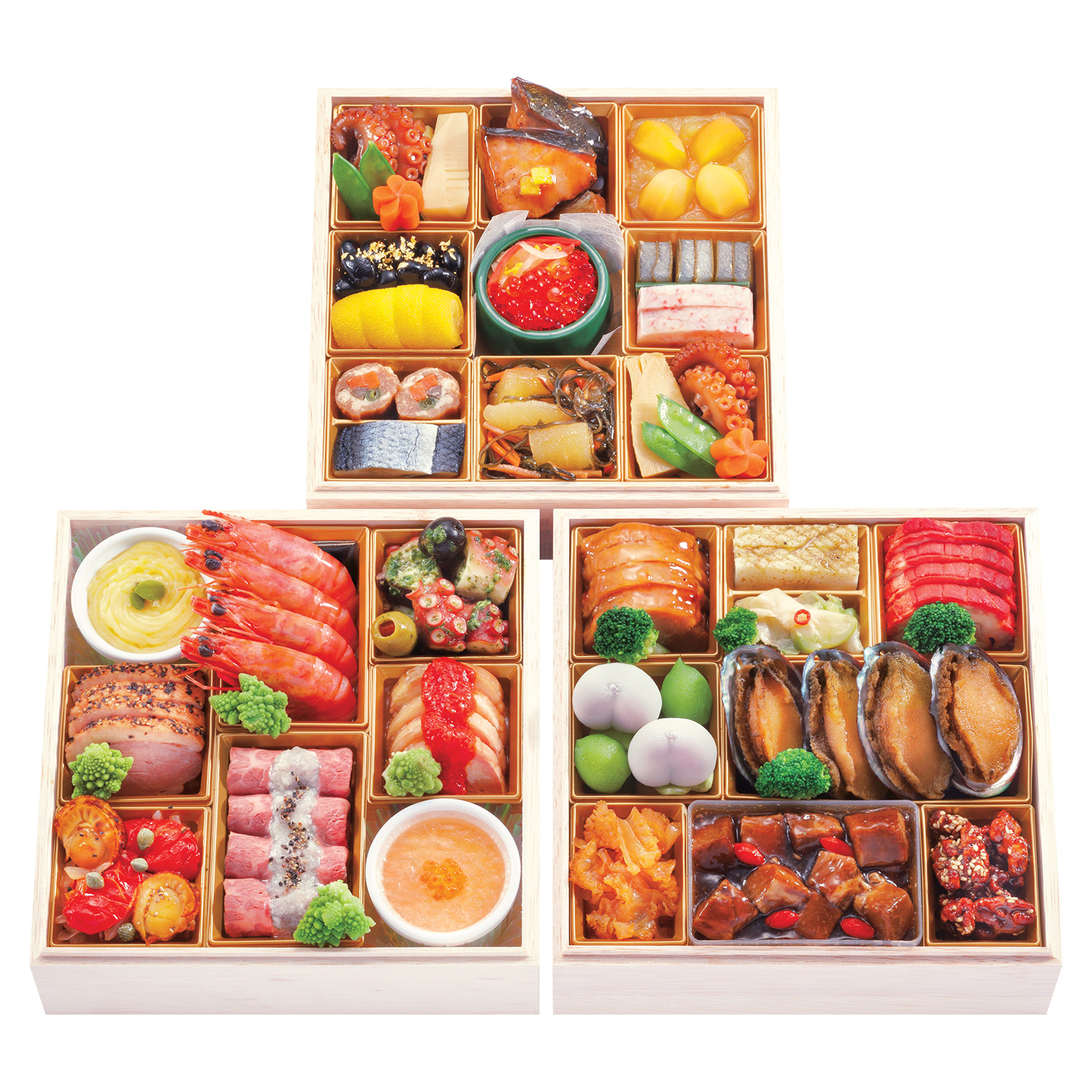 筍旨煮、味付絹さや、椎茸旨煮、蛸やわらか煮、鰤照焼 柚子添え、栗きんとん オレンジ風味、黒豆金箔、網笠柚子、いくらなます、かじき昆布〆、蟹真丈、豚八幡巻、鰊酢〆、数の子醤油漬、梅人参