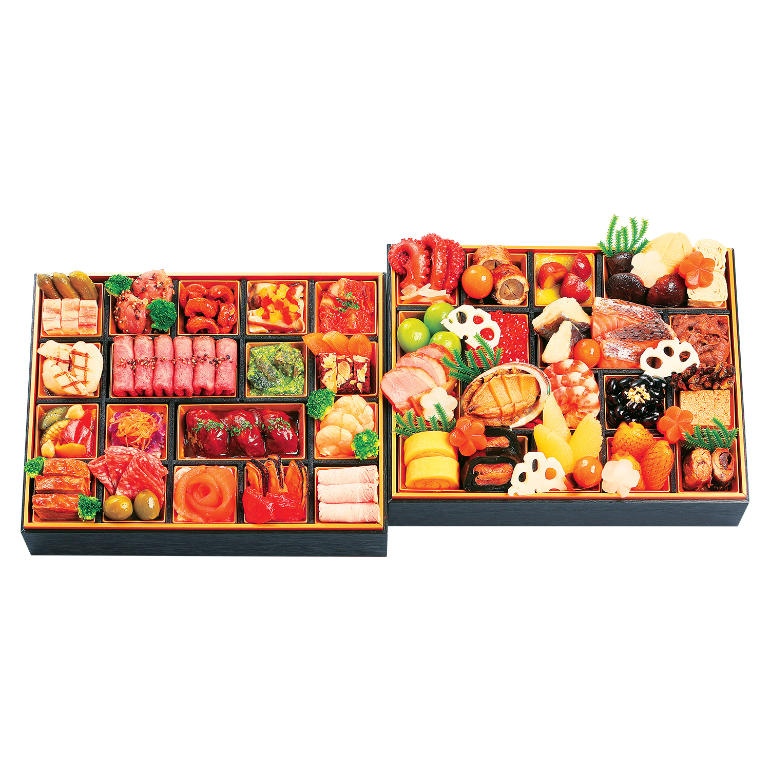 たこ小倉煮、なます、鰻八幡巻、きんとん、渋皮栗甘露煮、しいたけ煮、筍煮、焼ゆば巻、若桃甘露煮、味付いくら、サワラ西京焼、鮭味噌幽庵焼、牛肉のしぐれ煮、合鴨スモーク、きんぴらごぼう、あわび煮、松前漬け、車海老旨煮、切干大根煮、金箔黒豆煮、田作り煮、鶏松風、柚子伊達巻、にしん昆布巻、味付数の子、いか松笠雲丹焼、子持鮎甘露煮、金柑甘露煮、梅型ねじり酢大根、梅型ねじり人参煮、花酢れんこん