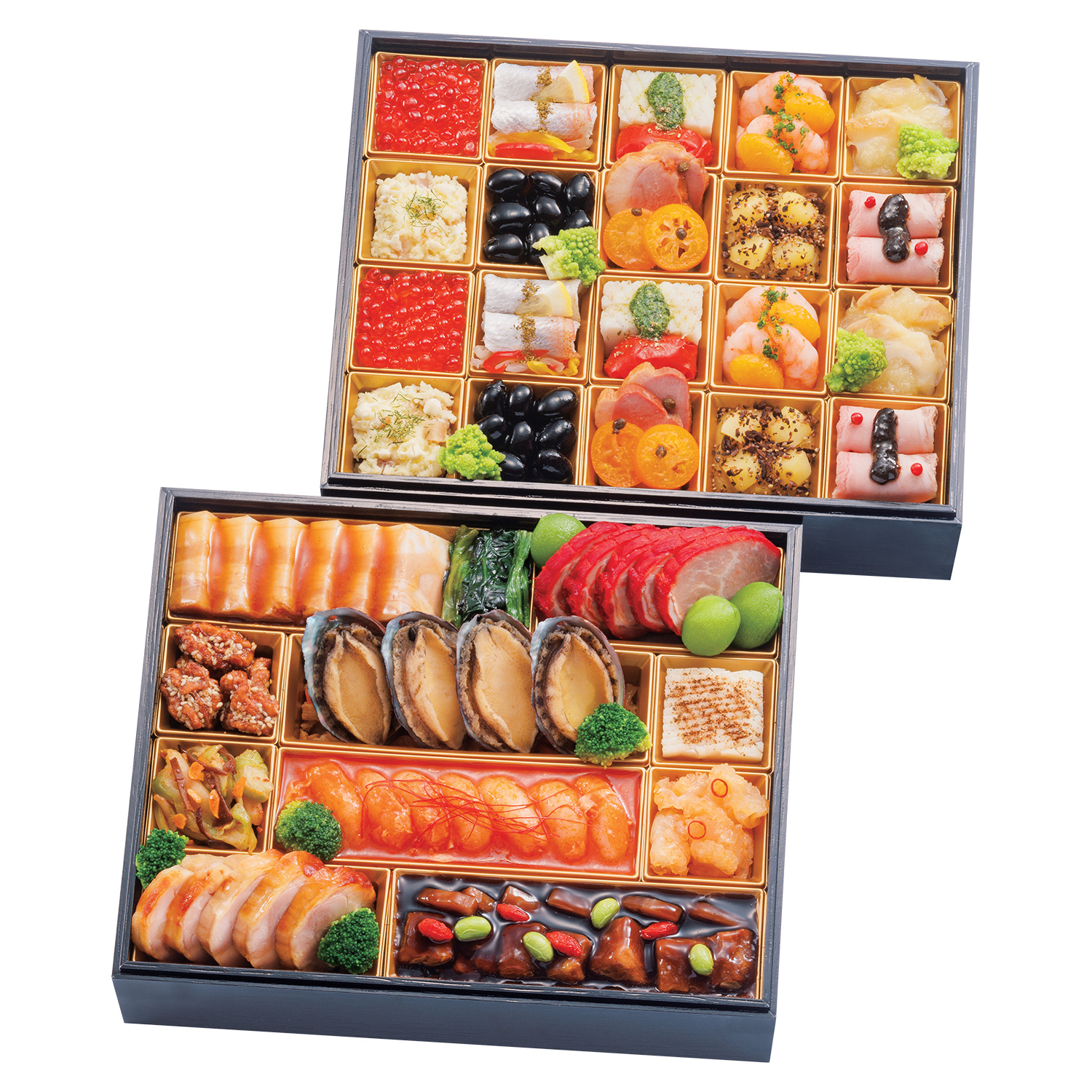 豚角煮ほうれん草添え、煮豆、蜜汁叉焼、若桃蜜煮、くるみ飴炊き、あわびオイスター煮、大根田舎煮、茹でブロッコリー、烏賊白焼花椒の香り、ラー油ザーサイ、海老のチリソース、くらげ甘酢漬、黒酢の酢豚、酒醸鶏