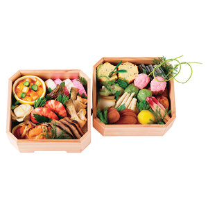 初代が裏千家の家元から懐石の心を伝授され、明治35年創業。裏千家の茶事を担う名店は、伝統に磨きをかけた料理、懐石の真髄を伝えます。<1段目>いかうに和え胡瓜、紅白蒲鉾、炊きもろこ、結び鱚南蛮漬、花百合根甘煮、車海老旨煮、蛤生うに焼き、合鴨ロース味噌漬け焼<2段目>亀甲オランダ真蒸、平目求肥昆布押し、くわい旨煮、柳串差し(抹茶団子、鶏団子、海老団子)、鰆幽庵焼、あわび旨煮、からすみ、五三竹旨煮、栗甘煮、はじかみ