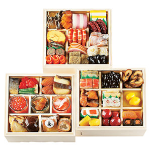 鰊旨煮、穂付き筍含め煮、梅花人参、絹さや、松笠烏賊、銀鱈西京焼、いくら醤油漬、数の子松前漬、紅白なます、鰆西京焼、干椎茸甘露煮、有平蒟蒻煮、唐墨、鶏八幡巻