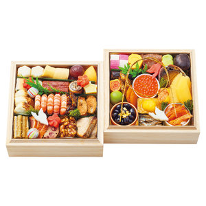 鮭年輪巻、ぶどう豆、南天いくら、椎茸旨煮、市松紅白蒲鉾、数の子、鶴かぶら(赤)、栗きんとん、あわび旨煮、黒毛和牛時雨煮、からすみ、もろこ鞍馬煮、粉吹き田作り、お多福豆麩、伊達巻、初梅甘煮、紅白柿なます、鶴かぶら(白)、穴子昆布巻、海老黄味寿司