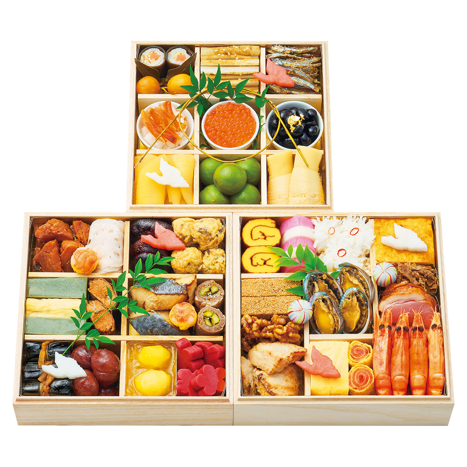 紅白小袖蒲鉾、菊かぶら、祝海老、鮭年輪巻、あわび旨煮、牛肉時雨煮、のし烏賊、袱紗玉子、鰤西京焼、伊達巻、合鴨ロース、胡桃甘煮、鶏味噌松風、手毬餅、紅白鶴かぶら