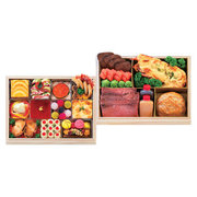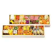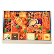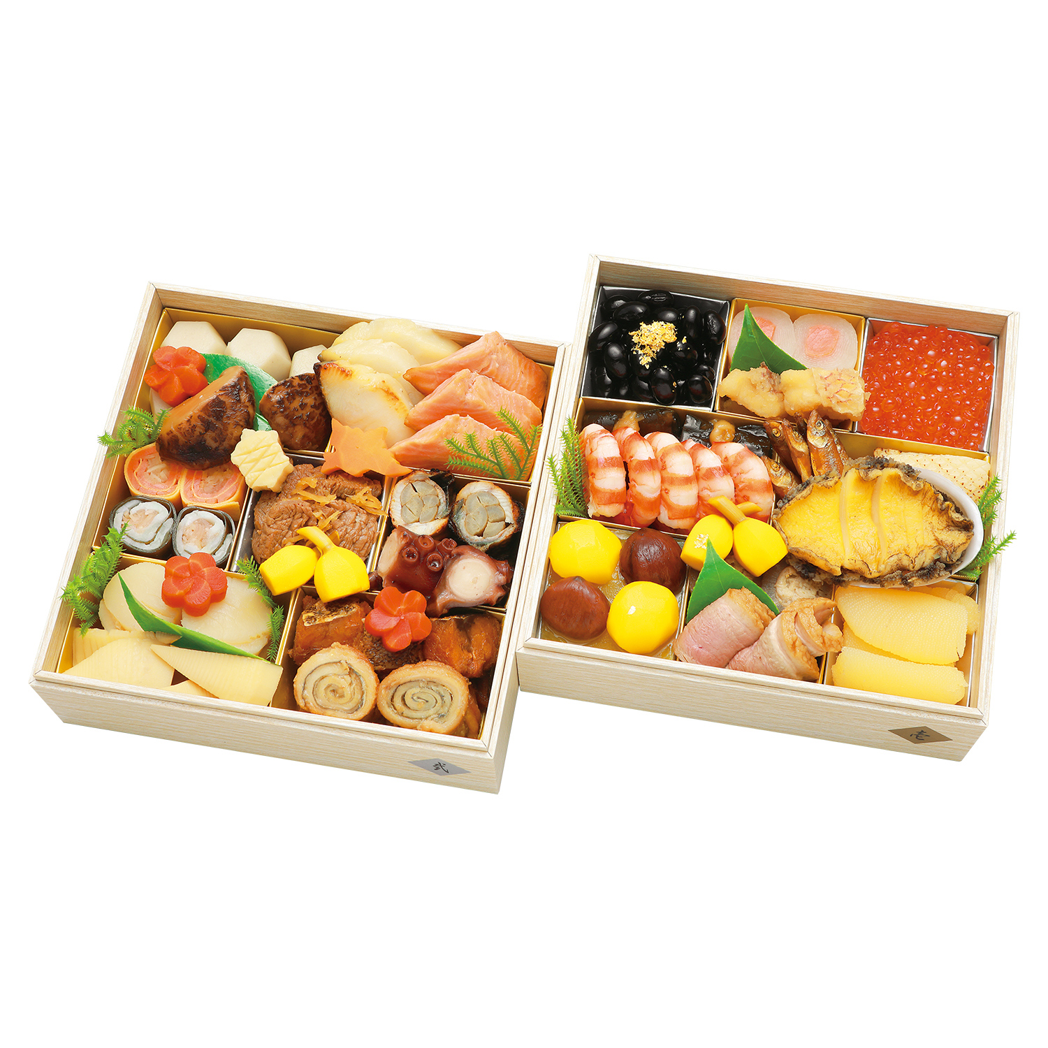 銀だら西京焼、鮭西京焼、六方小芋煮、椎茸含め煮、鰻八幡巻、蛸柔らか煮、牛肉しぐれ煮、鮭の錦糸巻、鯛の龍飛巻、真鱈うま煮、穴子鳴門巻、貝柱白煮、たけのこ煮、梅花人参煮、鶴人参、亀竹の子煮