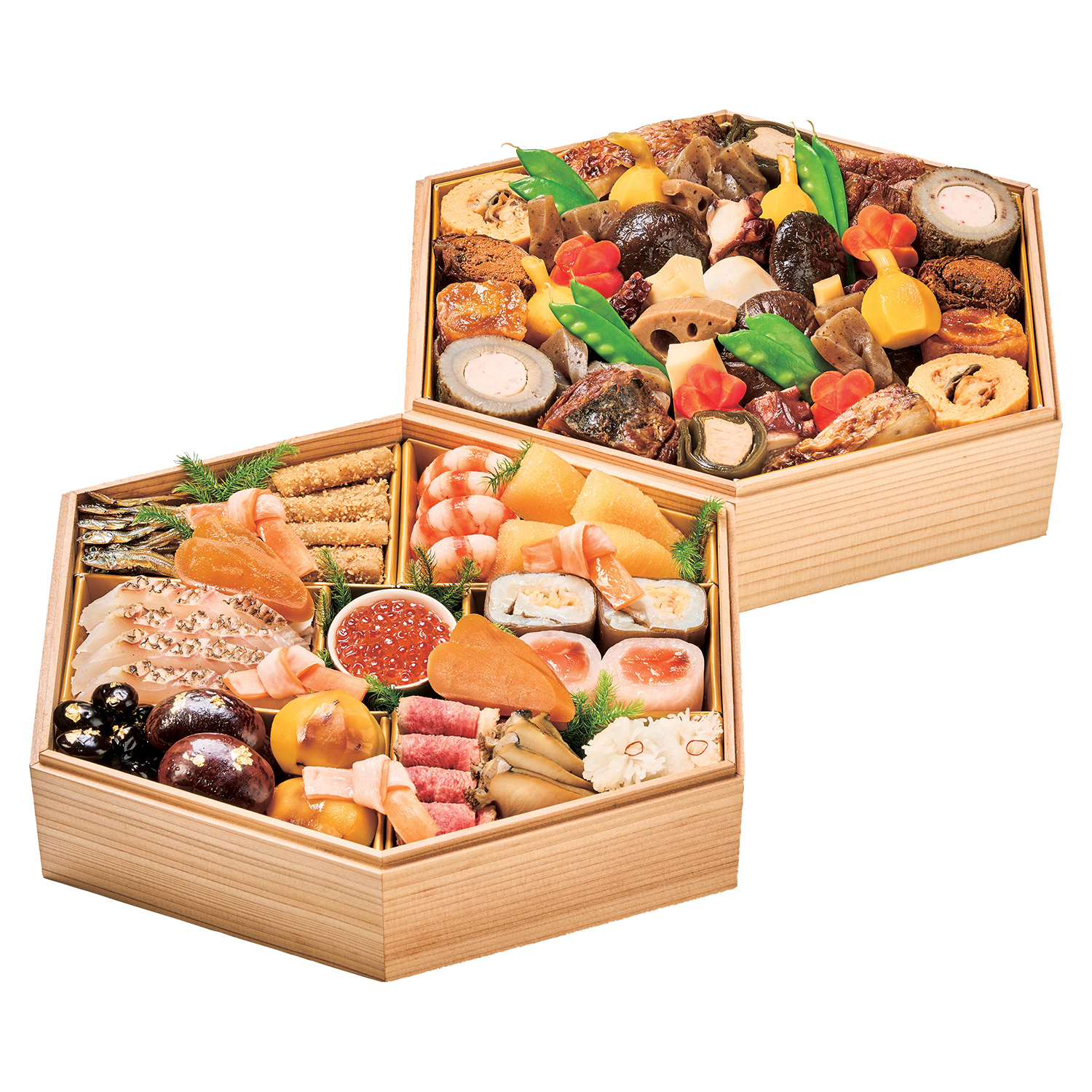 田作り、たたき牛蒡、味付数の子、車海老旨煮、鯛酢〆焼霜、紅白なます、味付けいくら、ひらめ求肥巻、サーモン絹巻、花豆甘煮、栗蜜煮、黒豆甘煮、合鴨ロース煮、鮑旨煮、菊花蕪、唐墨、結び紅白なます