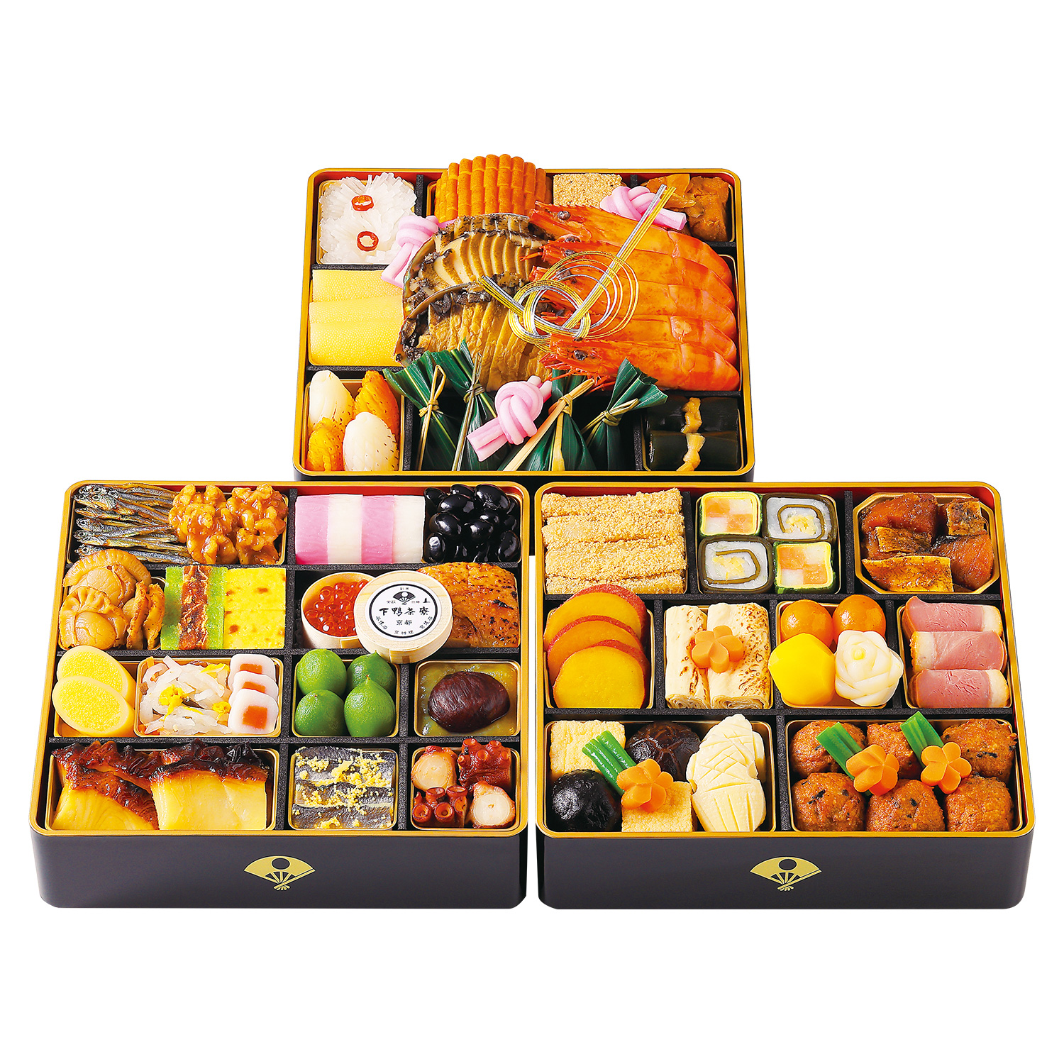 黒豆甘露煮、紅白蒲鉾、くるみ飴煮、田作り、鶏柚子胡椒焼、いくら醤油漬、慈姑かすてら、博多柚子柿、焼帆立、栗きんとん、若桃シロップ漬、身巻鮭真丈、紅白なます、子持烏賊、蛸の旨煮、子持ままかり、からす鰈西京焼