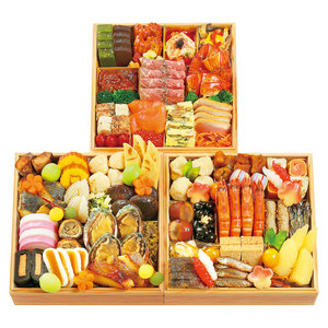 鶏真丈、たら煮、てまり餅、鯛昆布巻、サーモントラウト錦糸巻、きんとん、渋皮栗甘露煮、金箔黒豆煮、車海老旨煮、ごぼう胡麻和え、田作り煮、柚子かぶら、さごし醤油炙り、なます、鶏松風、もろこ煮びたし、牛肉のしぐれ煮、味付数の子、松前漬け、きぬさや煮、梅麩甘煮、金柑甘露煮、ちょろぎ