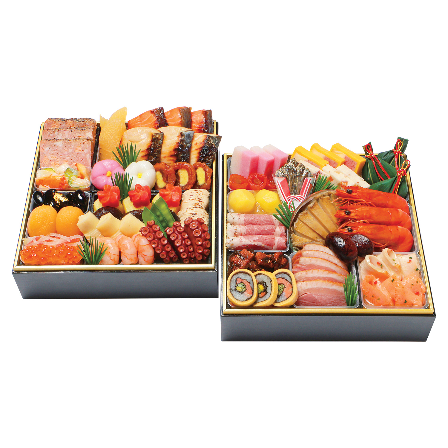 海老艶煮3尾、紅白蒲鉾3切、ドライトマトワイン煮3切、市松チーズ南瓜ムース包み3切、ドライフルーツフロマージュ3切、鮑旨煮1個、合鴨ロース6切、チキンマリネ 約35g、サーモンマリネ 約20g、笹よもぎ餅3個、黒花豆甘露煮2個、紅白錦糸巻3切、マンゴーなます 約30g、栗きんとん 約50g、アンデスポークパストラミ3枚、まぐろ昆布 約25g、田作り照煮 約7g