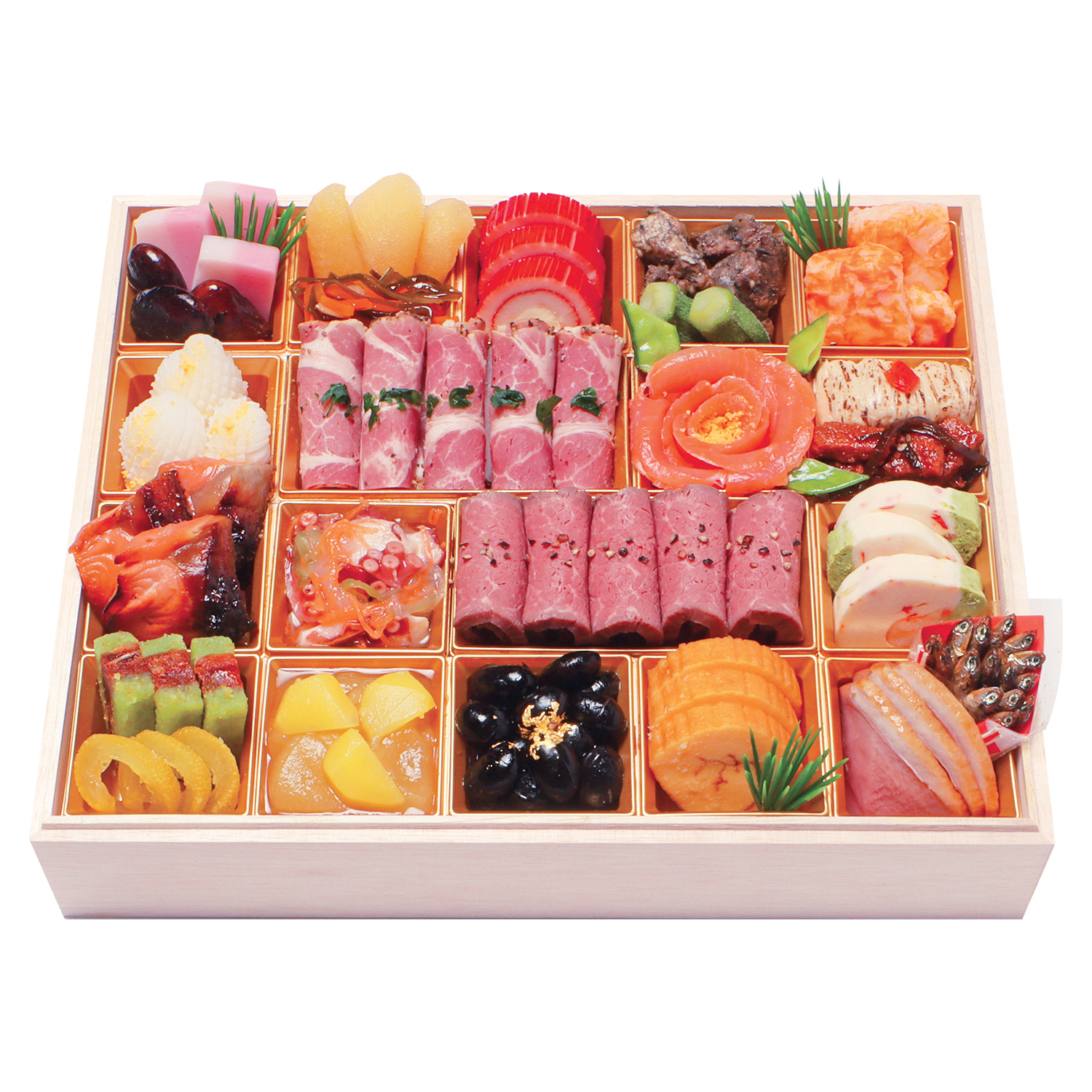 アンデスポークパストラミ(パセリ0.2g)5切、ローストビーフ5枚、合鴨ロース3切、海老風味3個、鮭柚庵焼(20gカット)3切、紅白蒲鉾3切、黒花豆甘露煮3個、祝い数の子3切、松前漬15g、海老とアスパラのテリーヌ3切、柚子柿グリーンサンド3切、編笠柚子3切、チーズオードブル3切、松笠烏賊(煎り玉子)3個、蛸マリネ30g、伊達巻3切、栗きんとん50g、田作り照煮7g、豚タン炭火焼25g、福豆葡萄煮(金箔)35g、スモークサーモン(煎り玉子)5枚、絹さや3切、一口焼き湯葉3切、まぐろ昆布15g、オクラ塩茹で2本