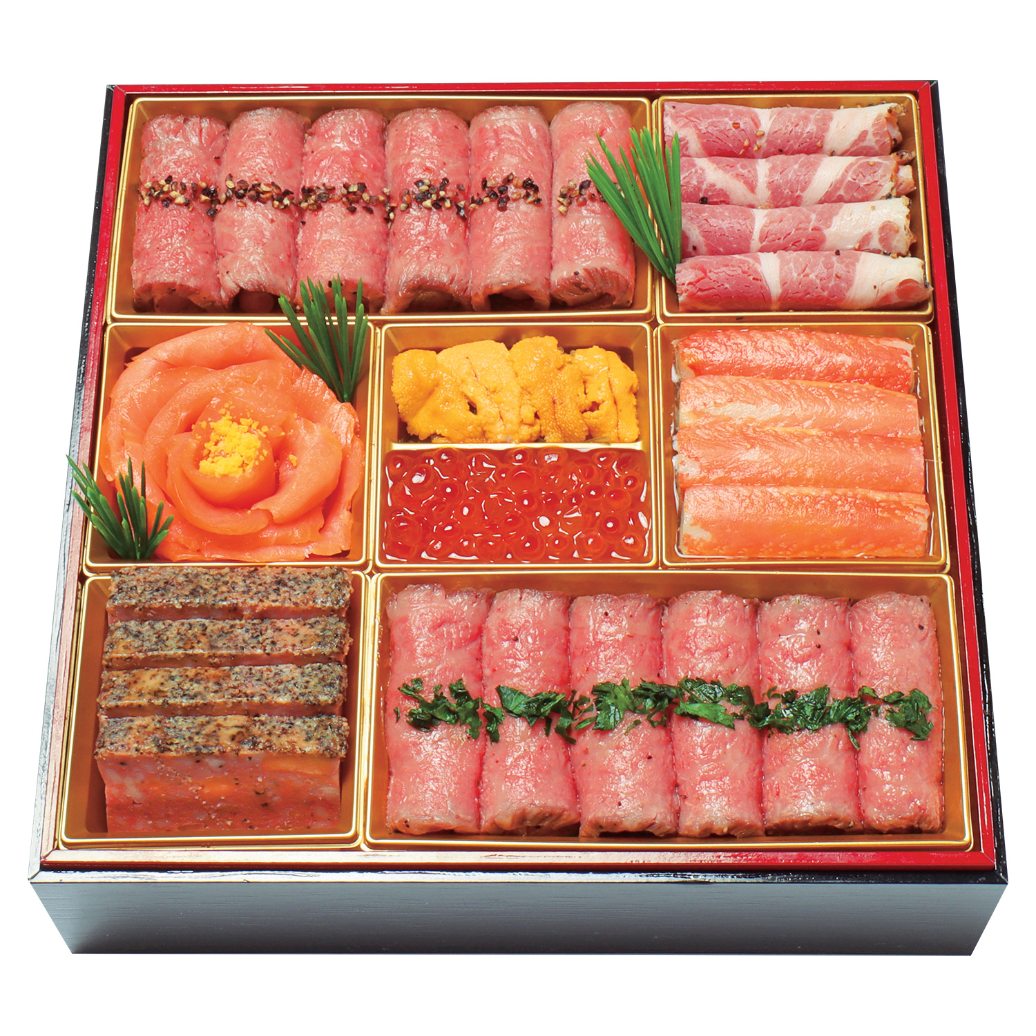 音羽川のせせらぎ響く、京都・洛東の名料亭が贈る迎春の美味。縁起のよい食材を使った料理を中心に、彩りも鮮やかに盛り合わせました。<内容>ローストビーフ6切、アンデスポークパストラミ4枚、焼蟹酢漬4本、ズワイ蟹甘酢和え80g、いくら40g、数の子松前漬40g、雲丹10g、スモークサーモン(煎り玉子)5枚、チーズインスパイシーミート4切、ローストビーフ6切