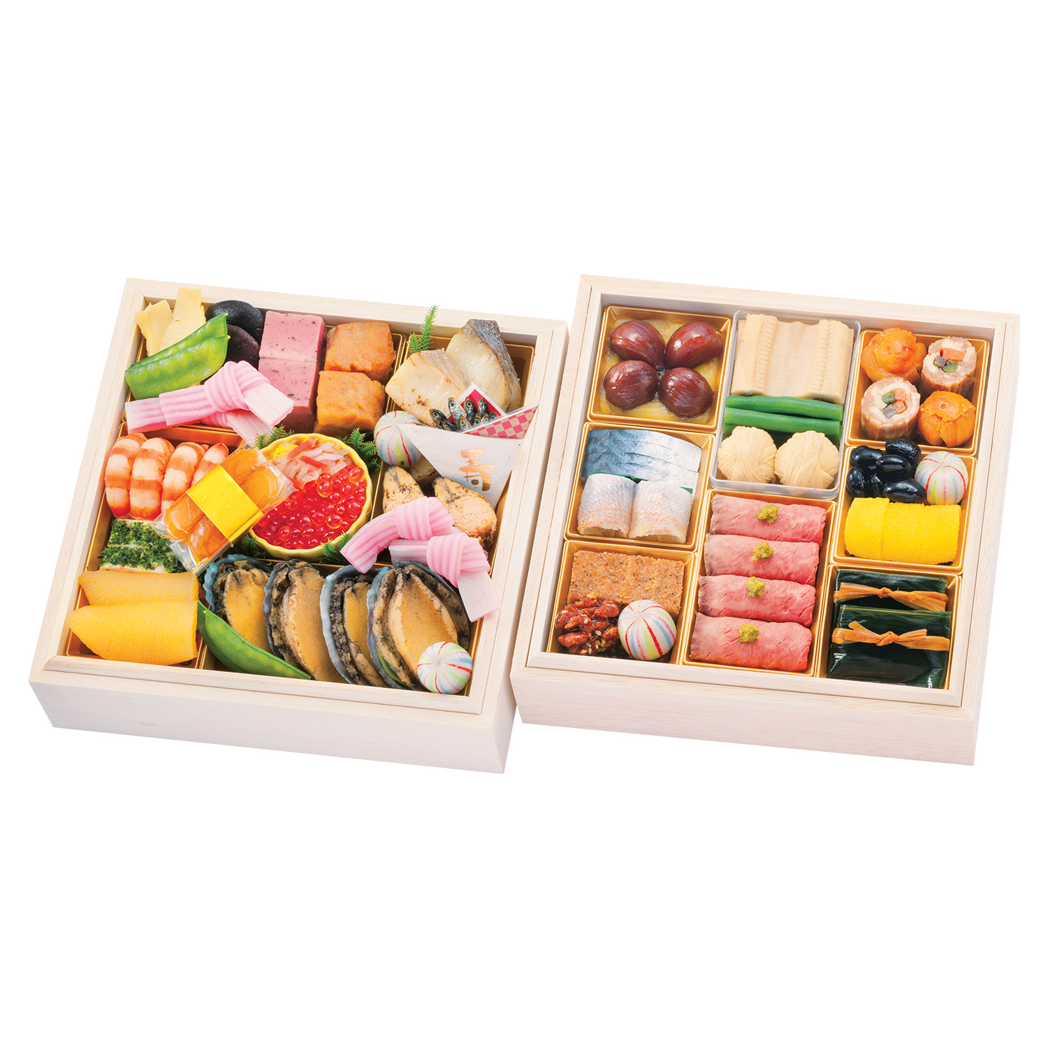 筍旨煮、椎茸旨煮、味付絹さや、赤じそ入り京生麩含め煮、真鱈甘露煮、銀鱈西京焼、手まり餅、田作り、子持鮎甘露煮、車海老旨煮、蟹真丈磯辺焼、数の子醤油漬、からすみ、いくらなます、あわび旨煮、結び紅白かまぼこ