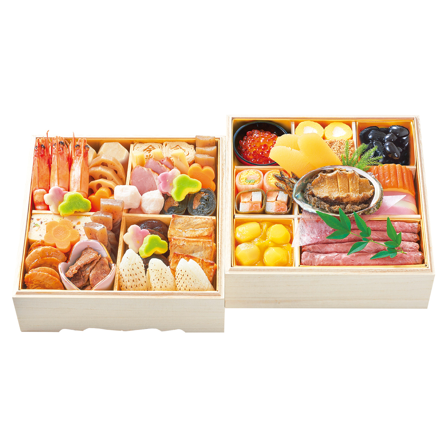 すき焼・しゃぶしゃぶを中心とした、日本料理の老舗。こだわりの牛肉を贅沢に盛り込んだおせちをご用意しました。<1段目>いくら、錦玉子、のし鶏、黒豆、錦糸砧巻、市松昆布巻、数の子、田作り、伊達巻、蒲鉾(赤)、蒲鉾(白)、煮鮑、栗きんとん、ローストビーフ(モモ)、ローストビーフのタレ<2段目>里芋、有頭海老、蓮根、巻湯葉、牛蒡、穂付筍、合鴨ロース、豆腐しんじょう、鰊昆布巻、黒毛和牛時雨煮、博多高野豆腐、手綱蒟蒻、帆立、どんこ椎茸、鰆西京焼、焼烏賊松笠、梅麩、松麩、梅人参