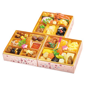 ローストカットチキン、金平牛蒡、有頭海老、市松蒲鉾、紅白梅かんざし、チーズ伊達巻、黒毛和牛旨煮(銀杏)、数の子(いとがき)、黒豆、紅白長老喜