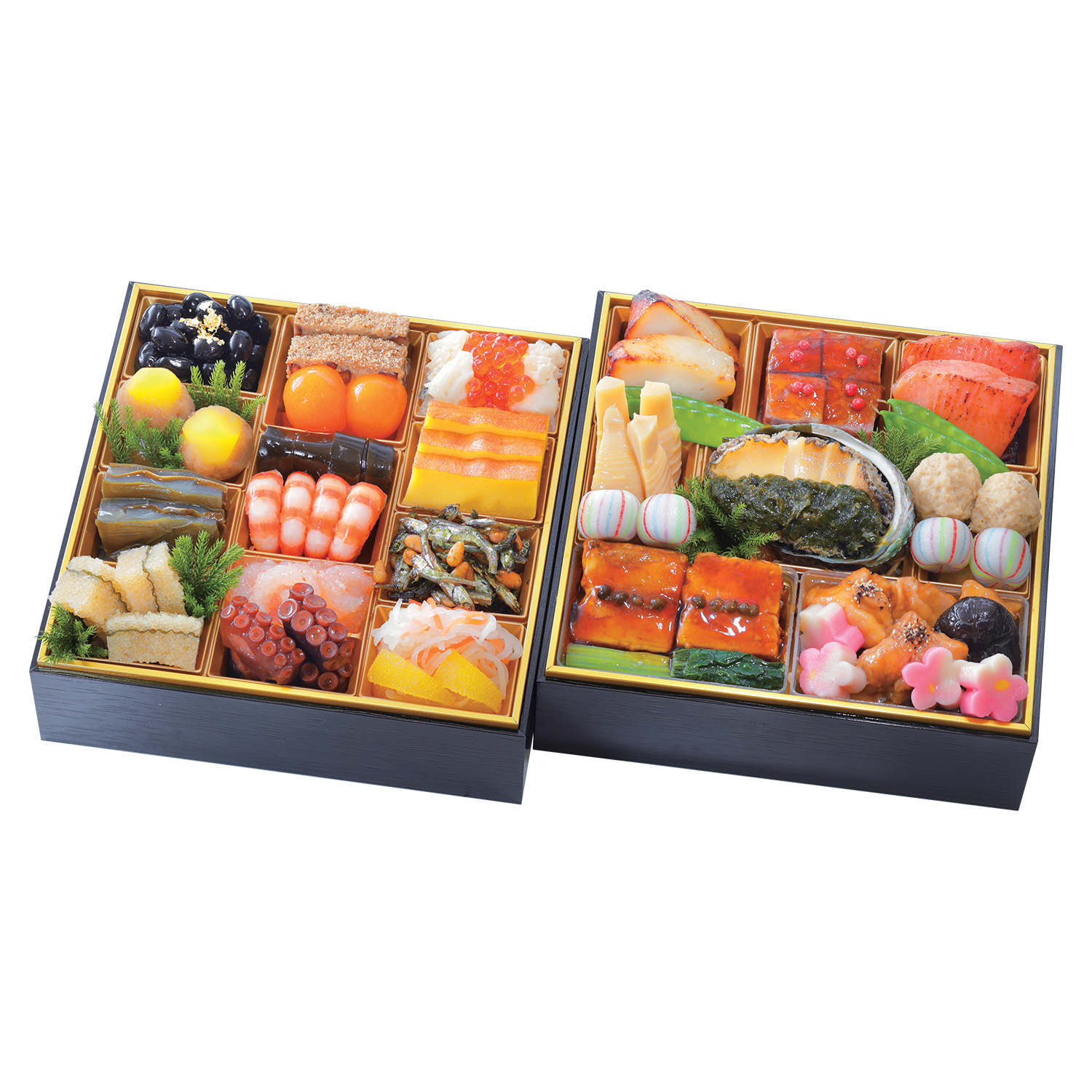 黒豆煮(金箔添え)、和栗きんとん、かじき昆布〆、味付子持昆布、小豆入り鶏松風、金柑蜜煮、にしん昆布巻、車海老旨煮、甘海老塩糀かんずり風味、蛸柔らか煮、帆立オイル煮わさび漬和え、いくら醤油漬、スフレ玉子、松の実入り田作り、セロリなます、網笠柚子