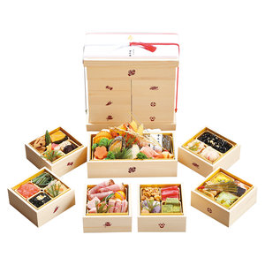 伊達巻、煮牛蒡、味付数の子、味付こごみ、海老煮、手まり餅、黒かじき昆布〆(パック詰め)、鶏肉八幡巻、花型人参煮、煮あわび、ぶり柚庵焼、かに風味かまぼこ、菜の花おひたし、人参煮、筍土佐煮