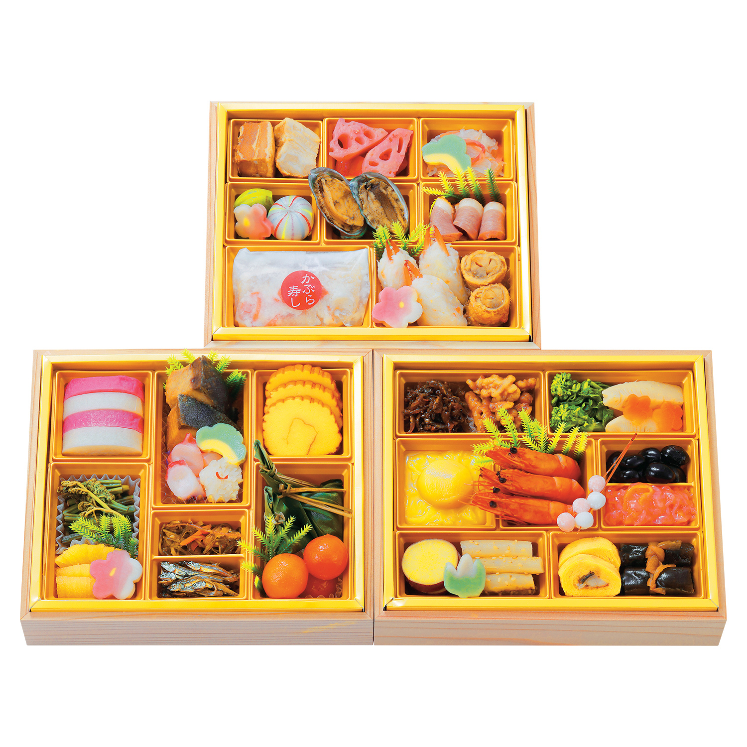 紅白おせち蒲鉾、ぶり照焼、たこの梅じそ風味、菊かぶら、松麩シロップ漬、伊達巻、味わらびしそ風味、味付き数の子、梅麩シロップ漬、いなか漬、味付いくら、田作り、鳴門金時笹麩、金柑甘露