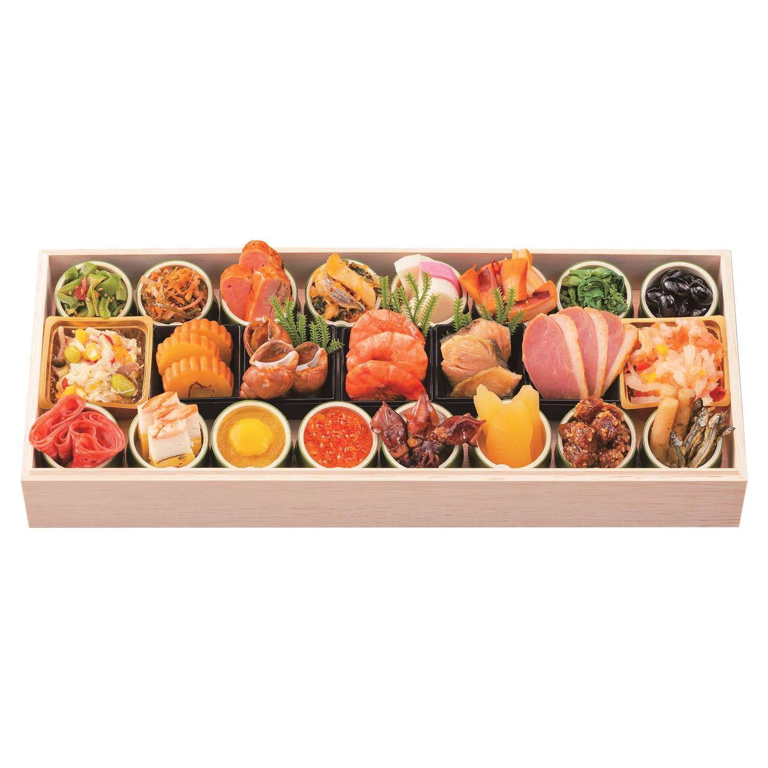 山くらげの胡麻和え、数の子松前漬け、チキンとチーズの二色焼き、鰊と小松菜の数の子和え、紅蒲鉾、白蒲鉾、いかのピリ辛和え、菜の花醤油漬け、黒豆煮、チキンとキノコの彩りサラダ、伊達巻、バイ貝醤油煮、海老艶煮、鮭の塩焼き、合鴨オレンジソース煮、大根と玉葱のサーモントラウトマリネ、ボロニアソーセージ、紅ズワイガニの紅白テリーヌ、芋きんとん、栗甘露煮、大根と人参のなます、いくら醤油漬け、焼ホタルイカ、数の子醤油漬け、まぐろの角煮ごま和え、片口鰯の田作り、牛蒡煮