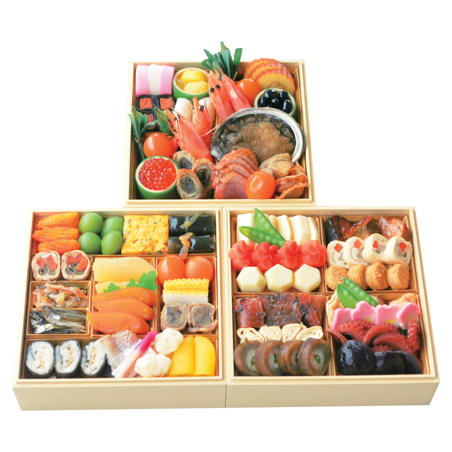 紅白かまぼこ、小袖昆布巻き、栗甘露煮、芋きんとん、いか松笠白焼き、えび艶煮、牛笹巻、伊達巻、黒豆煮、金柑甘露煮、いくら醤油漬け、紅白なます、穴子八幡巻、合鴨ロース、ホタテ照焼、あわび柔らか煮