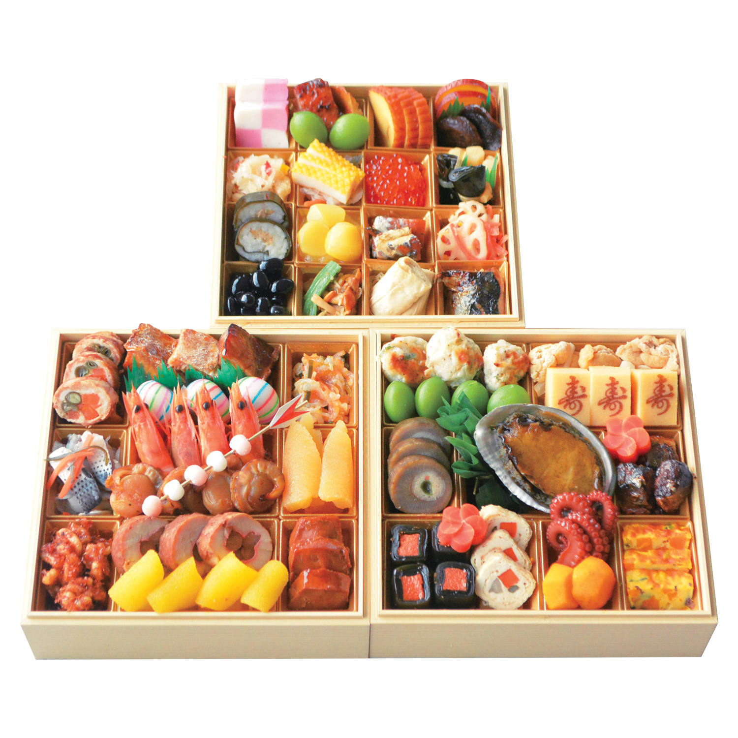 紅白市松かまぼこ、赤魚西京焼き、若桃甘露煮、伊達巻、丸十レモン煮、椎茸旨煮、レンコ鯛のエスカベッシュ、いか黄金焼、カナダ北寄貝と青菜の柚子胡椒和え、いくら醤油漬け、紅白なます、一口昆布巻、たたき牛蒡、竜皮巻、芋きんとん、栗甘露煮、棒だら、蓮根柚子マリネ、黒豆煮、青じそなめこ、巻き湯葉、にしん幽庵焼