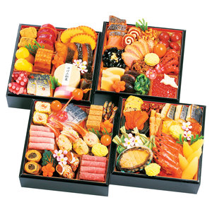 鮭味噌幽庵焼、柿鳴門、くるみ甘露煮、きんとん、渋皮栗甘露煮、金箔黒豆煮、合鴨山椒風味、牛肉のしぐれ煮、たこ小倉煮、金柑甘露煮、たら野菜つみれ、御所桜串、筍煮、しいたけ煮、菜の花煮びたし、梅型ねじり人参煮、味付いくら、鶴型かまぼこ