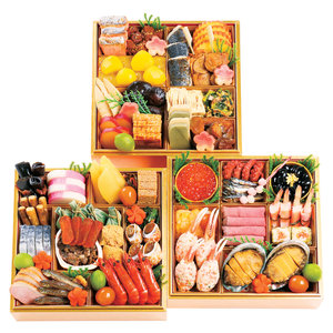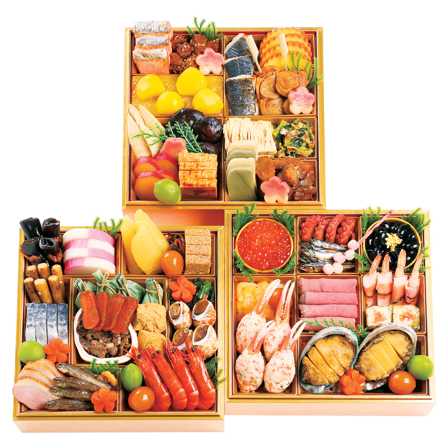 味付いくら、たこ小倉煮、田作り煮、梅ちらし、金箔黒豆煮、黄金いか、カニ爪真丈、きんぴらごぼう、ローストビーフ、ビーンズデミグラスソース煮、紅白海老結び、鯛昆布巻、あわび煮、なます、わかめ煮、梅型ねじり人参煮、若桃甘露煮、金柑甘露煮