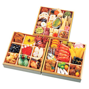 黒豆ふくませ、小蛸櫻煮、いくら醤油漬、甘鯛西京焼き、鰆の西京焼き、銀鮭味噌焼き、手まり和菓子、いか白焼き、クランベリーくるみ、寿焼印栗甘露、笹巻団子、きんとん、若鳥野菜巻、羽根飾り餅