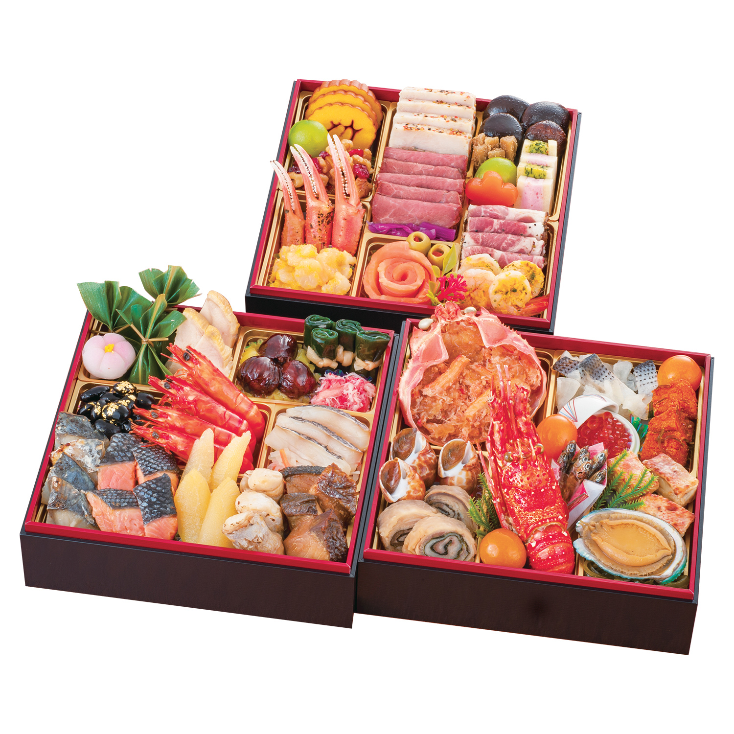 牛しぐれ笹包み、若鶏鳴門巻、三色団子串、渋皮栗きんとん、一口昆布巻、いか松笠、黒豆金箔、海老旨煮、真鯛きずし、紅白なます、サワラ味噌焼、紅鮭味噌焼、数の子、小鯛俵焼、鰤照焼